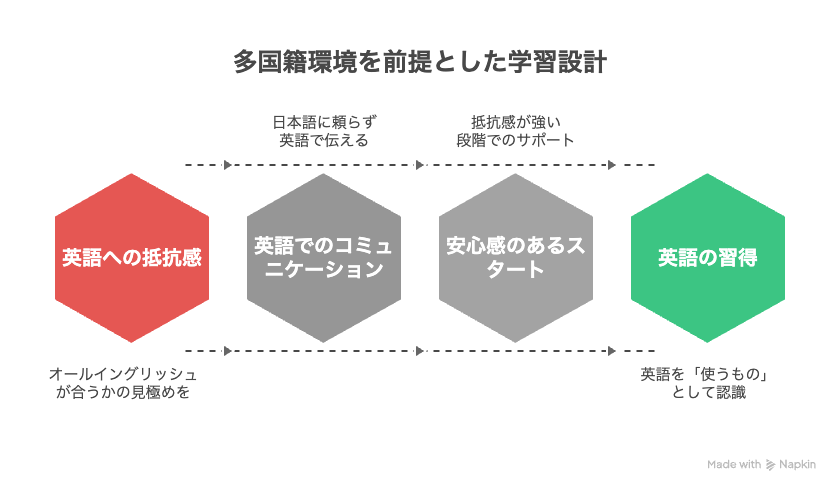 英語で学ぶ土台を日本にいながら整えられるため、渡航後の学習や生活への移行もスムーズになりやすくなります。