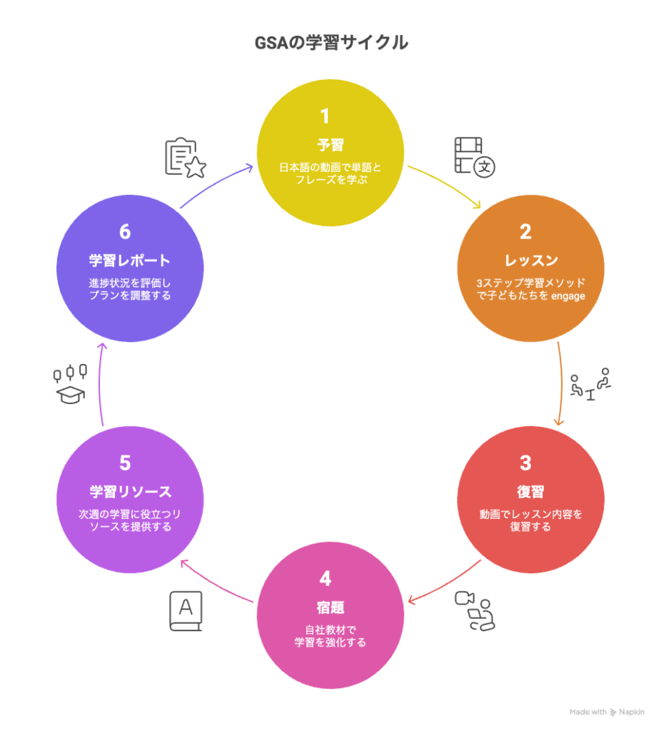 「Global Step Academy(グローバルステップアカデミー)」では、英語を“その場限り”で終わらせないために、明確な学習サイクルが用意されています。