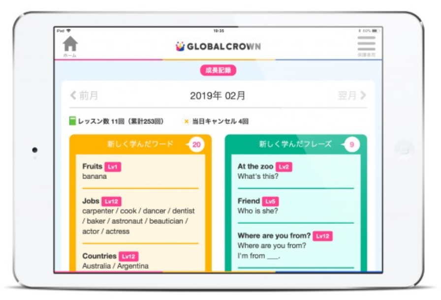グローバルクラウン | 公式HP | 約945円〜 | 9,200円 | 3歳〜 中学生 | 多国籍 (バイリンガル) | 日本語フォロー アプリ教材 |