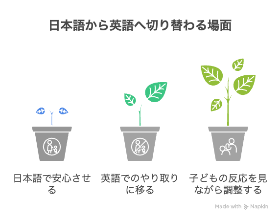 - 必要な場面だけ日本語を使っているか