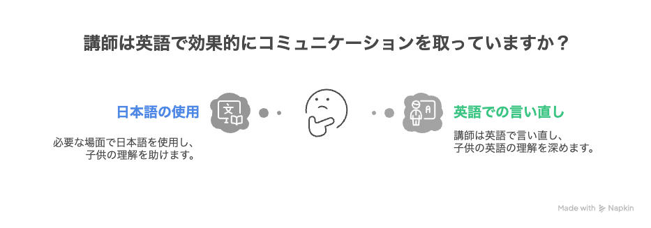 英語だけで押し切るのではなく、必要に応じて日本語でフォローしながら進めることで、「分からないまま固まる」「不安で黙ってしまう」状態を防ぐ設計になっています。