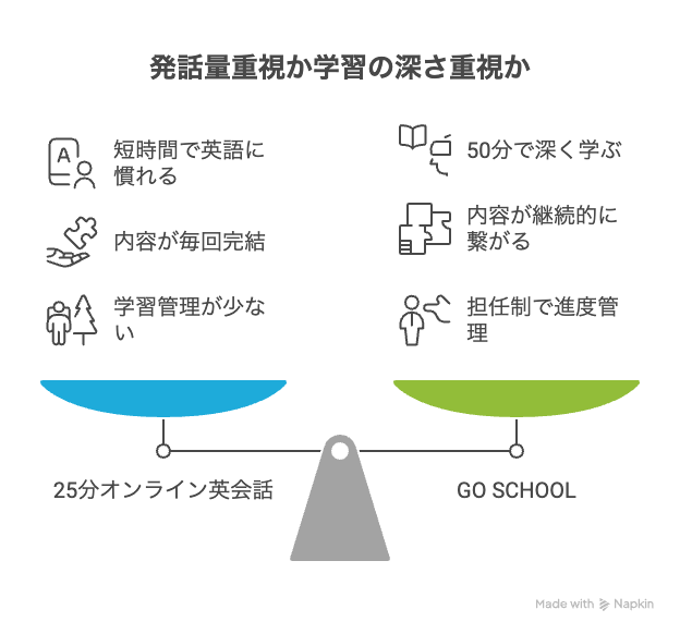 発話量重視か、学習の深さ重視か―ここが大きな分かれ目です。