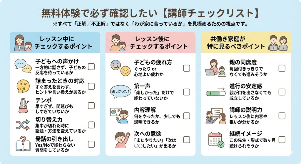 ここでは、体験レッスン中に必ず確認しておきたいポイントを整理します。