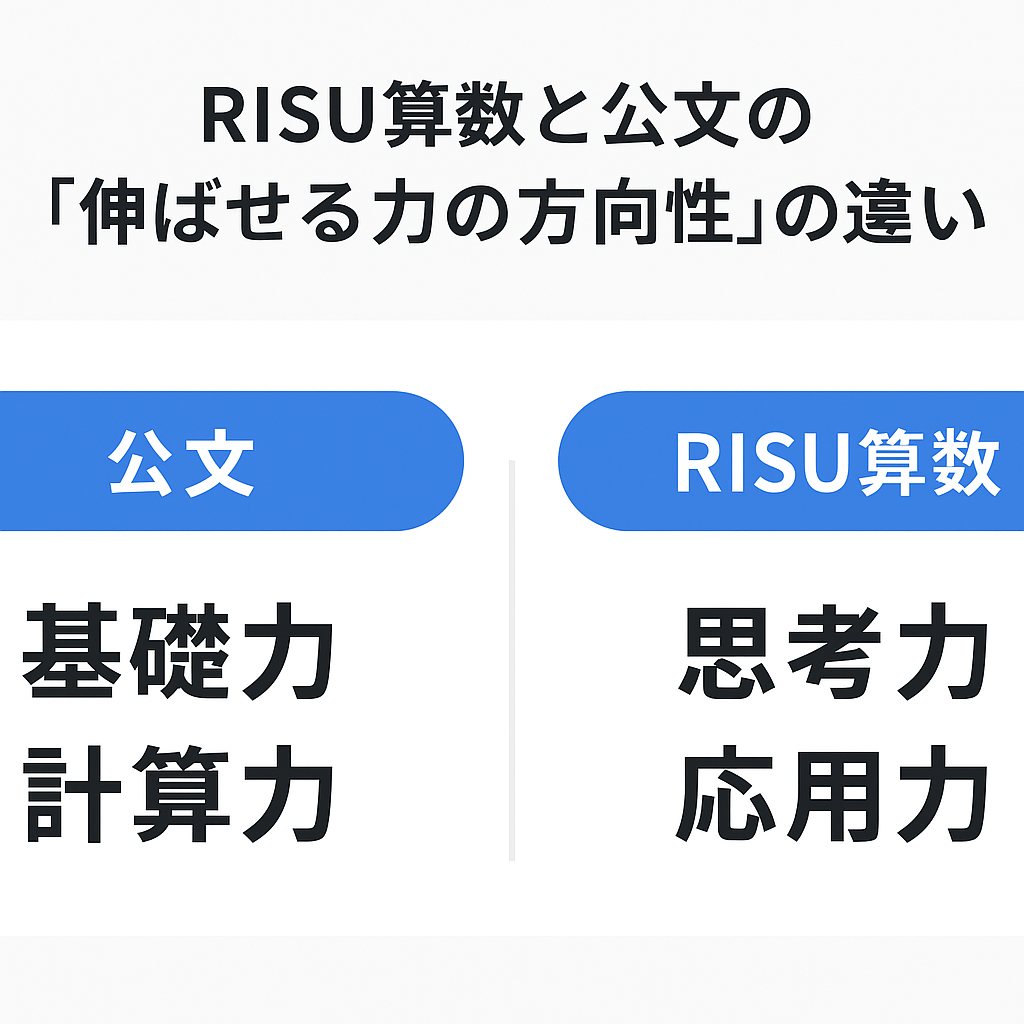 つまり、計算力に特化して「基礎力・計算力」に強みを発揮するのが「公文」、幅広い算数力をバランスよく伸ばし「思考力・応用力」を高めるのが「RISU算数」と整理できます。